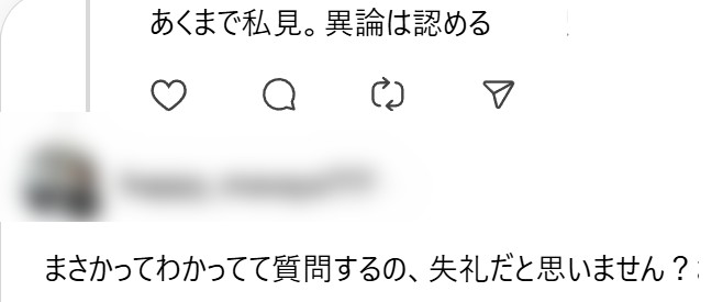 性格 七志野権兵衛(cd1e5389_6f2d52) |2025.11.8(09:21) やれやれ 異論は認めると表記しながらレスしたらキレられた... 喧嘩腰にレスしたわけではないのに◇オイラの投稿に①釈迦に説法②で?③何がしたいの?というレス来るけどスルー◇だったら最初からフルネームで表記しろや! 通報する お気に入りに入れる このユーザーをブロック
