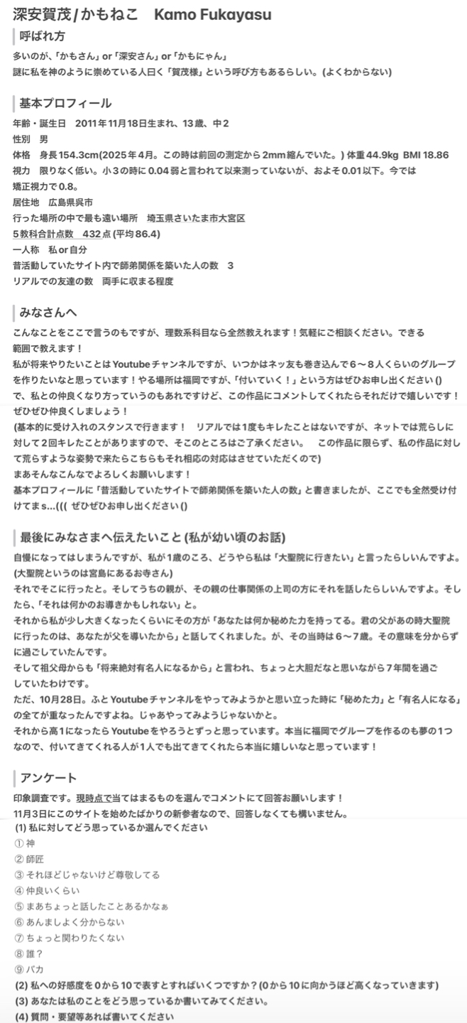 雑談 深安賀茂/かもねこ(fff983e6_6d65da) |2025.11.6(19:04) 仲良くなりたい人募集中! まだまだ全然募集してるぞっ! 自己紹介は画像の通りです。 いろいろな方と仲良くなって雑談がしたいですね() 気軽にお声かけください! 通報する お気に入りに入れる このユーザーをブロック